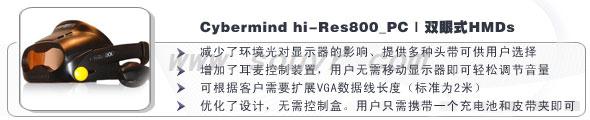 Cybermind hi-Res800_PC是一款全彩的SVGA沉浸式的头戴式显示器,它集高品质和卓越设计于一身,可满足用户的不同需求,且具有超高的性价比。广泛地应用于娱乐和仿真等各个领域。Cybermind hi-Res800_PC机身重小于600克;即插即用, 可同几乎任何类型的计算机相兼容,为用户提供3D 立体影像。